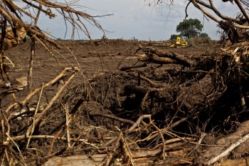 INVESTORS, LAND RECLAMATION, CLIMATE CHANGE, MONOCULTURE Bulldozers clear the land of Karuturi’s 100,000-hectare farm in Gambella. The destruction of the forest changes the local climate and spurs strong resistance by local communities.