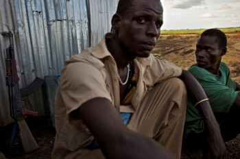 LAND USE, INVESTORS, INDIGENOUS COMMUNITIES, LAND RIGHTS Two local Anuak men guard the sugar cane nursery of Karuturi in the Gambella region in Western Ethiopia. Karuturi secured 100,000 hectares of virgin land from the federal government to plant sugar cane, rice, oil palms and cotton. The large-scale agricultural investments in the region have prompted an outcry from the local population, who accuse the investors of grabbing land.
